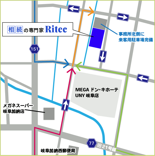 JR 岐阜駅より車で5分。事務所北側に来客用駐車場完備。