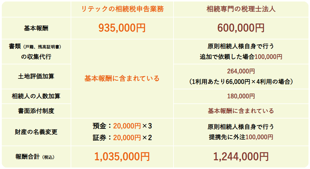リテックの相続税申告では通常の業務で必要な報酬は全て基本報酬に含んでおり、一般的な税理士事務所では追加業務扱いの書類の代行収集費用や、書面添付制度の適用に関しても基本報酬に含んでおります。